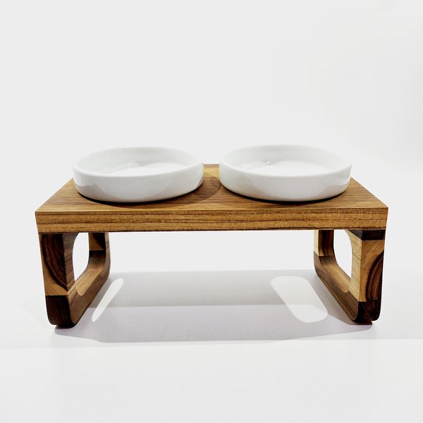 Comedouro Elevado em Madeira Teca com Potes de Porcelana 🐱 🐶