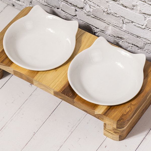 Comedouro para Gatos em Madeira Teca com Potes de Porcelana 🐱
